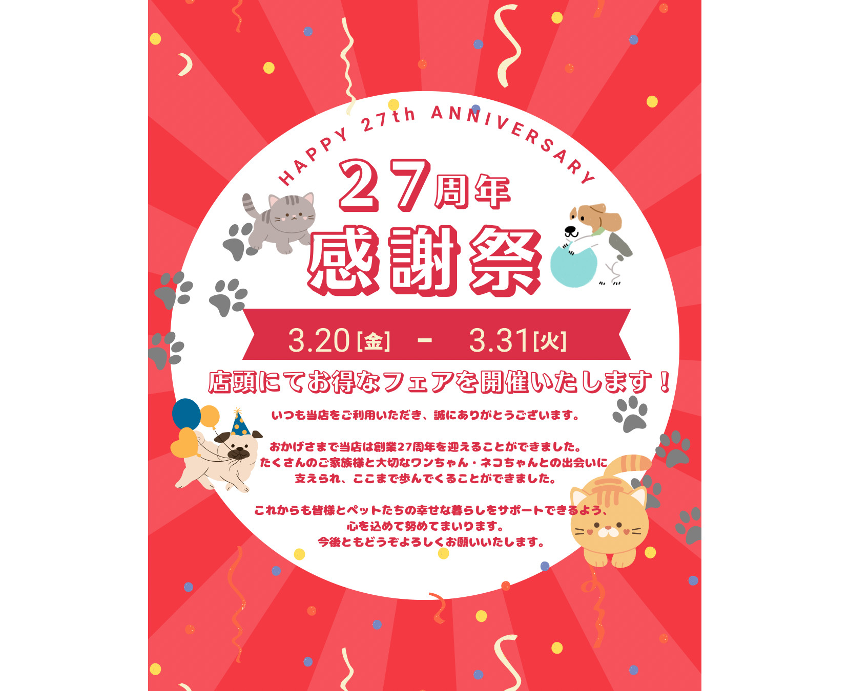 いつも当店をご利用いただき、誠にありがとうございます。 おかげさまで当店は創業27周年を迎えることができました。 たくさんのご家族様と大切なワンちゃん・ネコちゃんとの出会いに支えられ、ここまで歩んでくることができました。 これからも皆様とペットたちの幸せな暮らしをサポートできるよう、心を込めて努めてまいります。 今後ともどうぞよろしくお願いいたします。